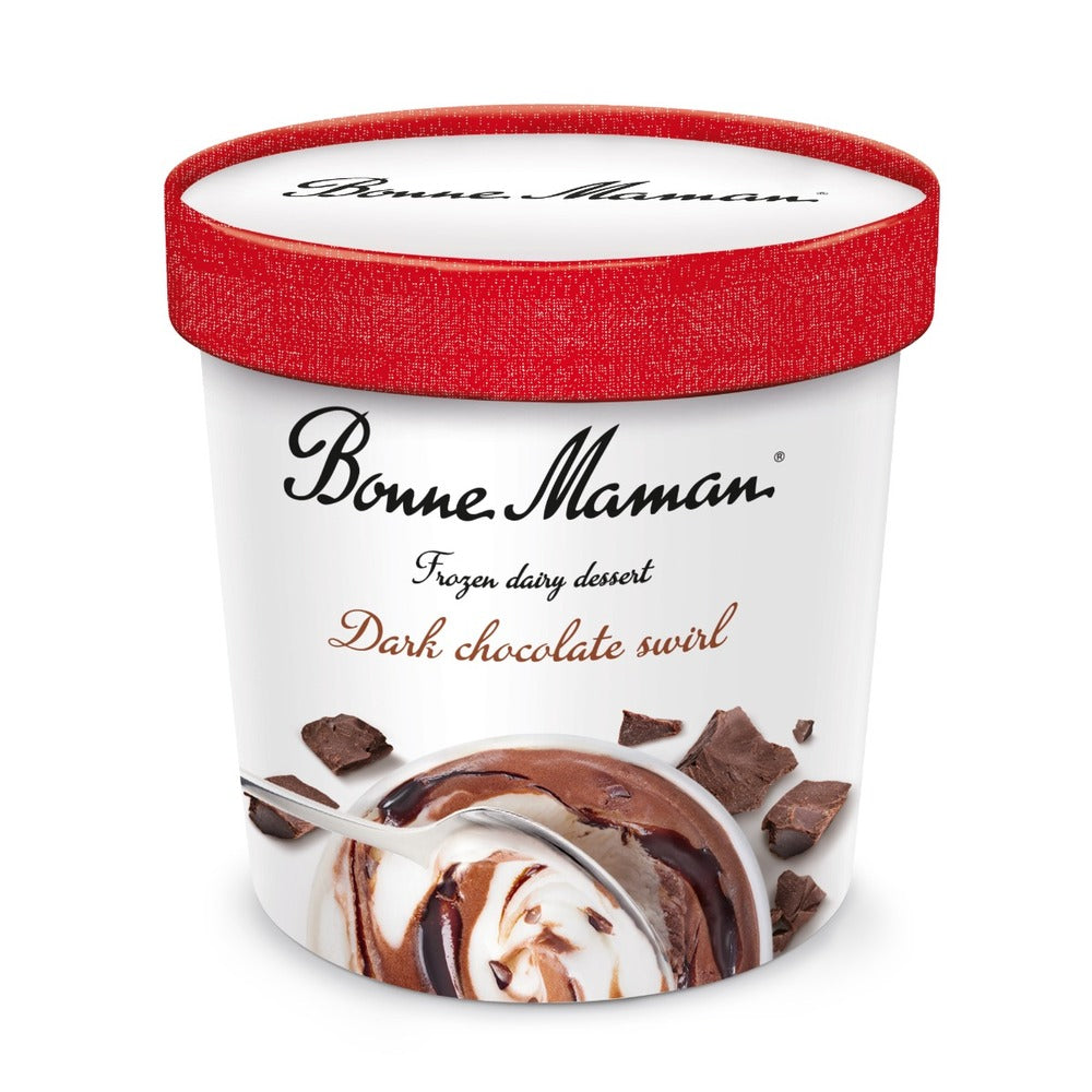 For its Dark Chocolate Swirl Frozen Dairy Dessert, Bonne Maman selected simple ingredients to create a creamy Frozen Dairy Dessert.
