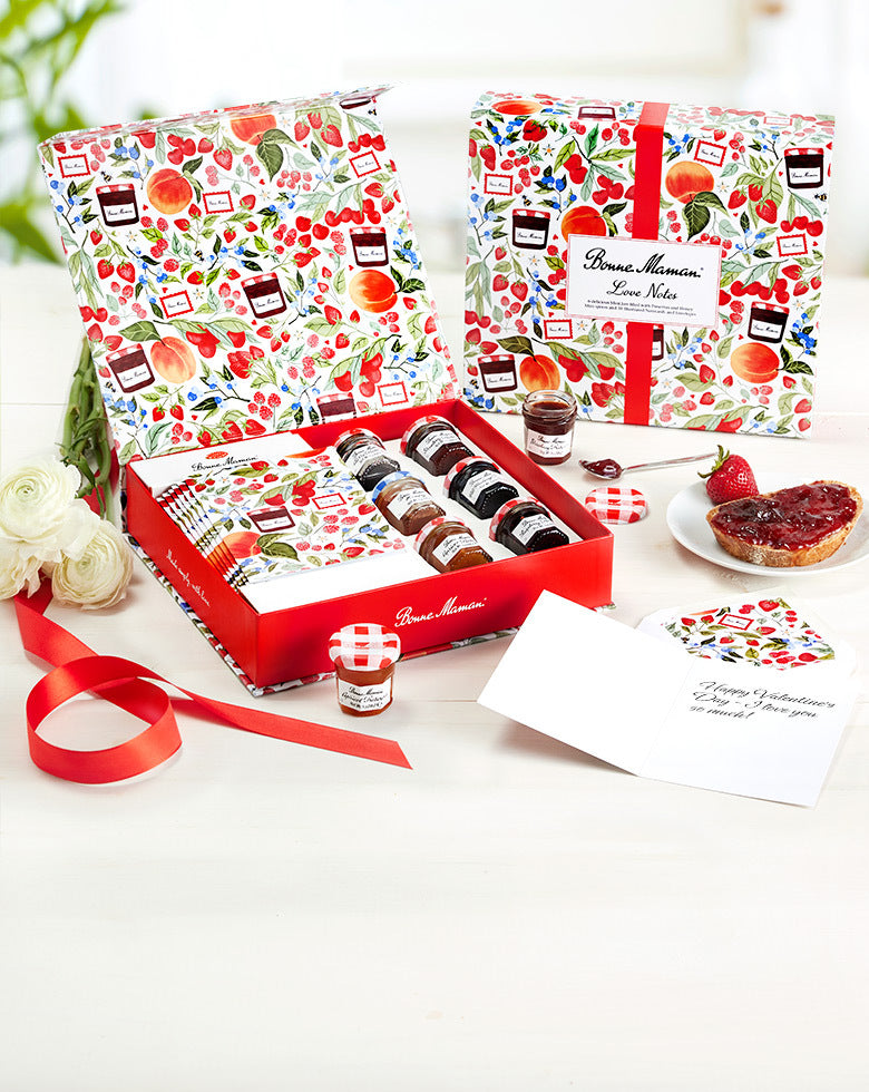 Gift six, delicious everyday flavors of Bonne Maman preserves paired with a beautifully illustrated stationary set and small spoon in the ‘Love Notes’ gift set, alongside an elegant Tote Bag, essential for everyday life. This heartfelt combination makes an ideal gift for the special people in your life.